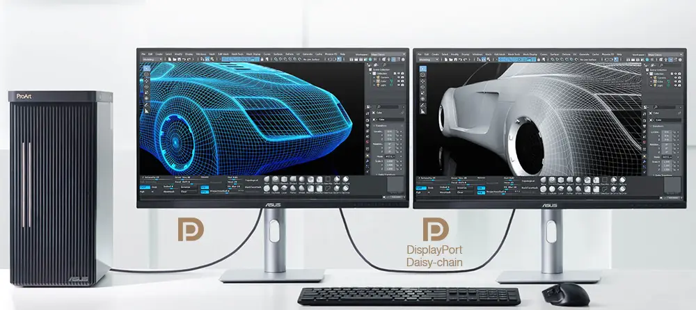 In addition to USB-C, ProArt display offers a myriad of connectivity options including HDMI®, DisplayPort™ (with daisy-chain support), USB Type-A, and additional USB-C downstream port for compatibility with a wide range of devices. DisplayPort allows users to daisy-chain multiple displays from a single video source, enhancing productivity. PA279CRV also includes a passthrough port for headphones.