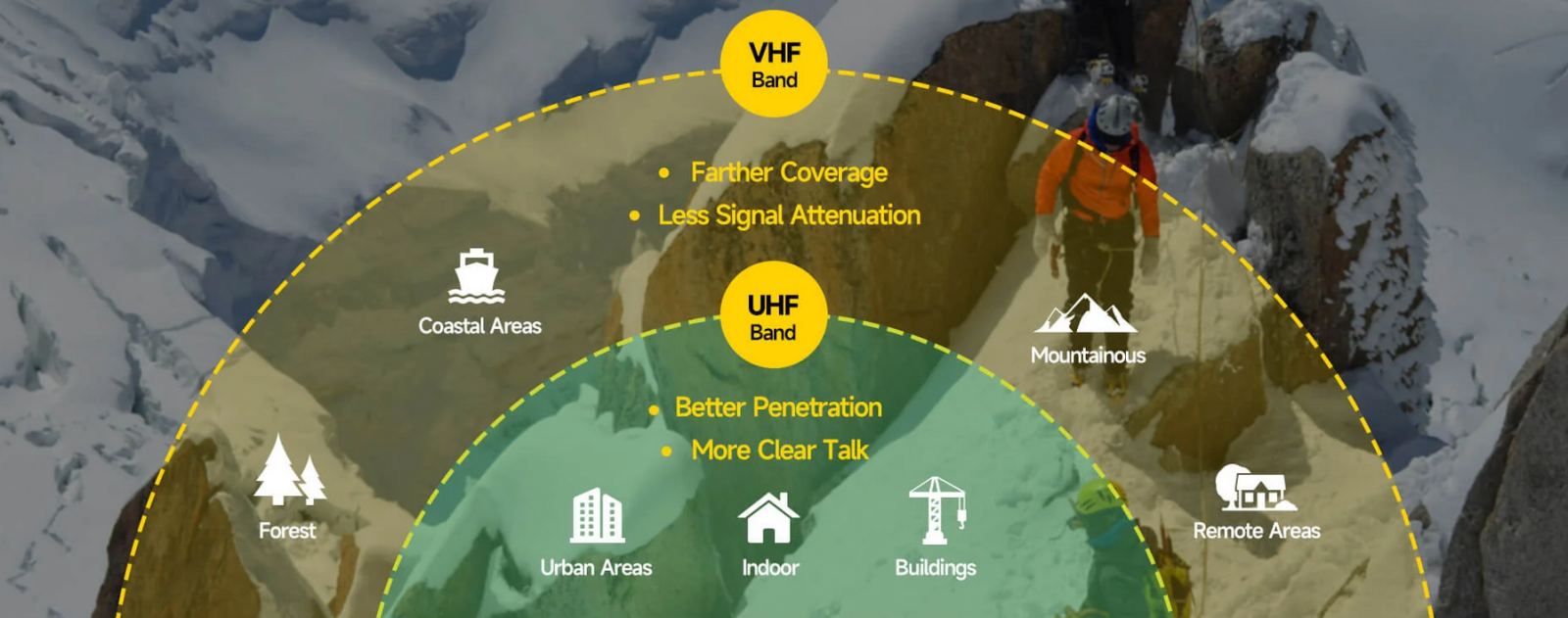 Supporting both UHF and VHF radios for flexible use based on actual conditions, the UHF band is suitable for short-distance communication, providing stronger penetration and clear and reliability while the VHF band is for long-distance communication, offering a wider coverage range and signal attenuation. Both UHF and VHF antennas are detachable, allowing you to replace each other as needed to achieve better signal reception quality or detach for easy to take.