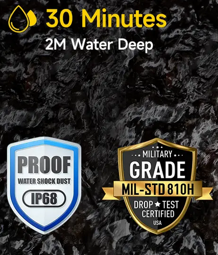 Rated IP68 (maximum depth of 1.5 metres up to 30 minutes) under IEC standard 60529