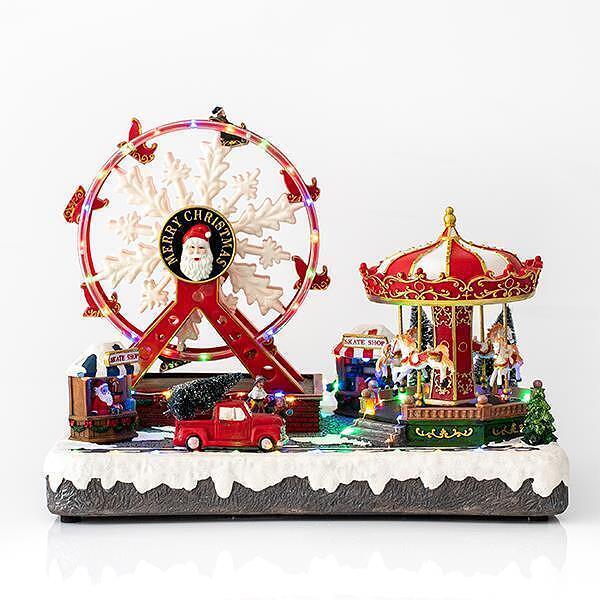 Тази завладяваща сцена на увеселителен парк съчетава осветление, музика и движение, за да внесе магия и радост във вашия дом. Идеална за декориране на дома, офиса или за създаване на празнична витрина.