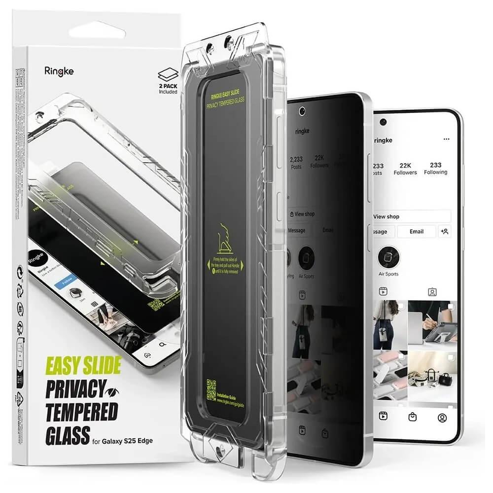 2 броя калени стъклени защитни покрития с определен ъгъл на виждане за дисплея на Samsung Galaxy S25 Edge - Ringke Privacy Easy Slide Tempered Glass 2 Pack (прозрачен)