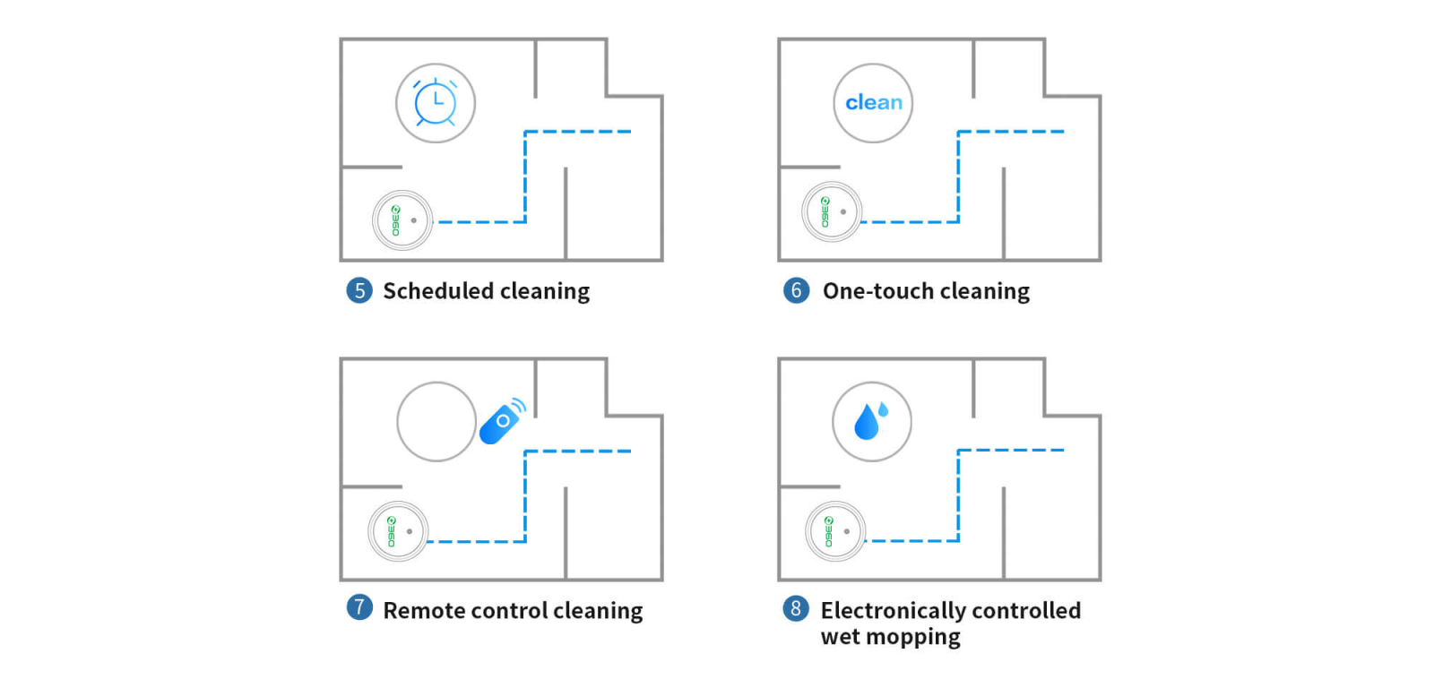 Generates human-like cleaning plans and perform zigzag routes for vacuuming and mopping. Fewer overlaps, higher coverage