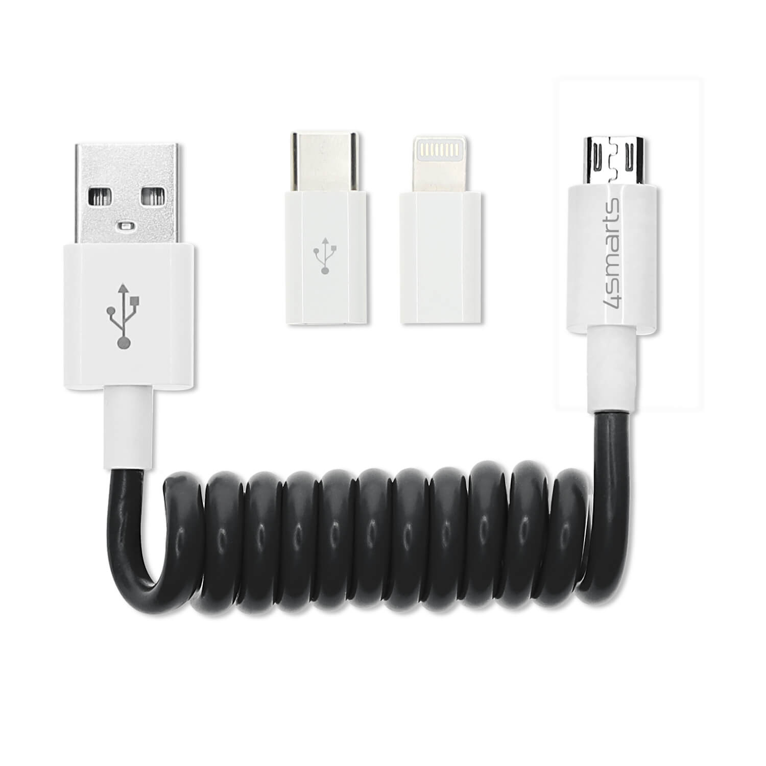Спираловиден MicroUSB кабел с USB-C и Lightning адаптери