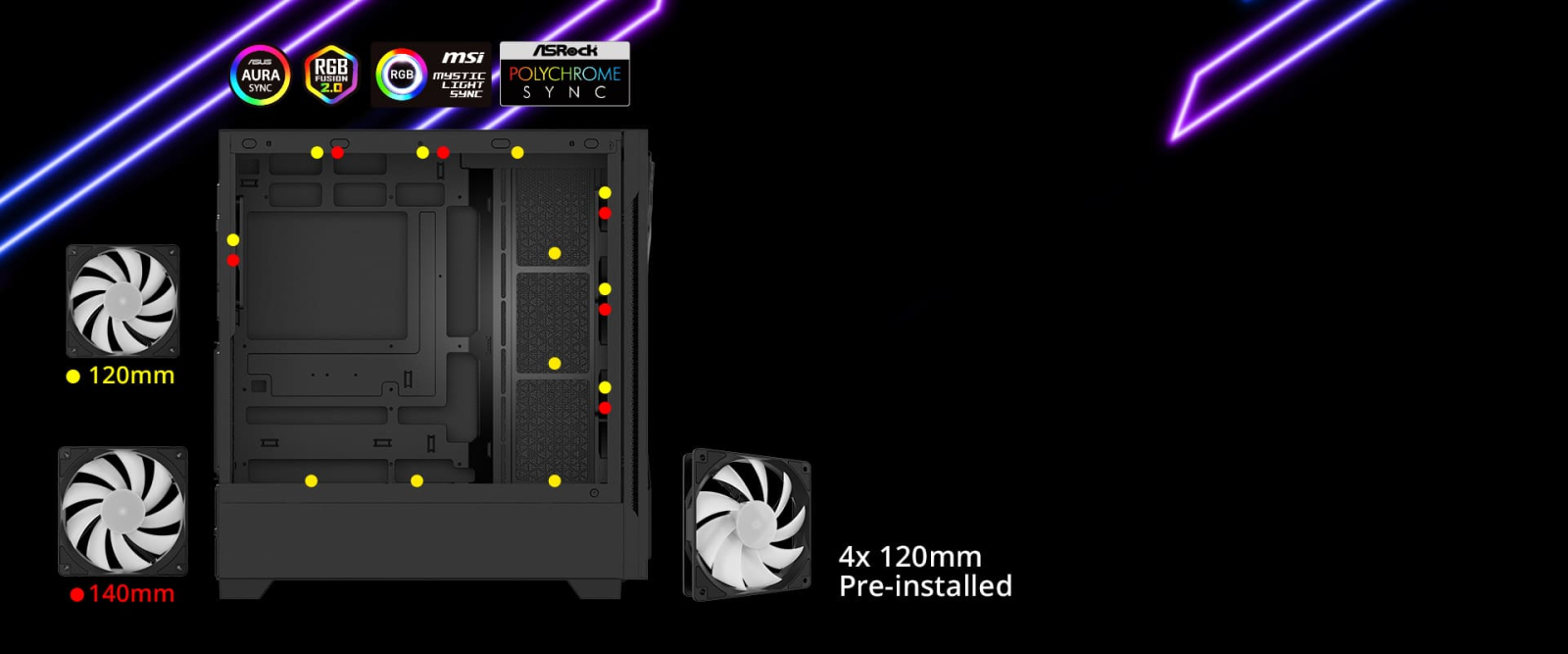 Including 4 pre-installed 120mm daisy-chained ARGB fans, STARKER AIR BTF supports up to 12x 120mm fans or a combination of 6x 140mm and 3x 120mm fans, providing outstanding airflow for even the most demanding builds. The pre-installed ARGB fans can be seamlessly controlled through compatible motherboard software, allowing for synchronized lighting effects with the rest of your ARGB components, for a stunning, unified setup.