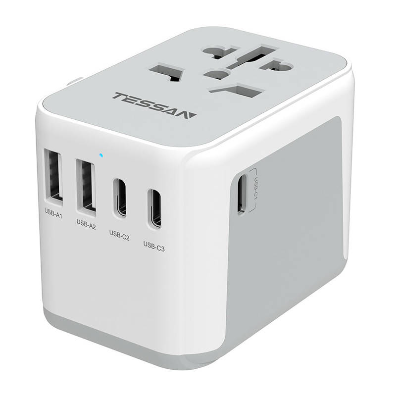 Адаптер за ел. мрежа с преходници за цял свят с 2xUSB-A и 3xUSB-C изходи (бял)  - Tessan Travel Adapter 633-FV