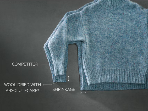 ![]() | Absolutecare гарантира, че дрехите няма да се свият AbsoluteCare използва технологията на термопомпата, движения на барабана и температури за безопасно сушене и на най-деликатните дрехи. Вълната гарантирано не се свива и коприната запазва формата си. Възстановява водозащитния слой на връхните дрехи и е със сертификат Woolmark Blue. *Сравнимо с плоско сушене. |