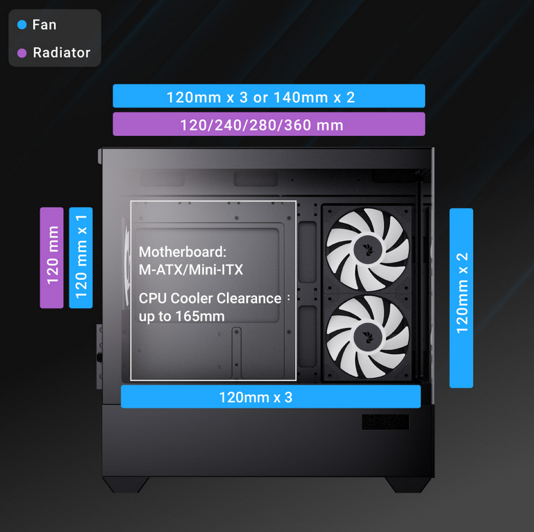 | Air Cooling | Top: 120mm x 3 or 140mm x 2 (Max.) Side: 120mm x 2 (Max.) (Included ARGB 120mm x 2) PSU Shroud: 120mm x 3 (Max.) Rear: 120mm x 1 (Max.) (Included ARGB 120mm x 1) |