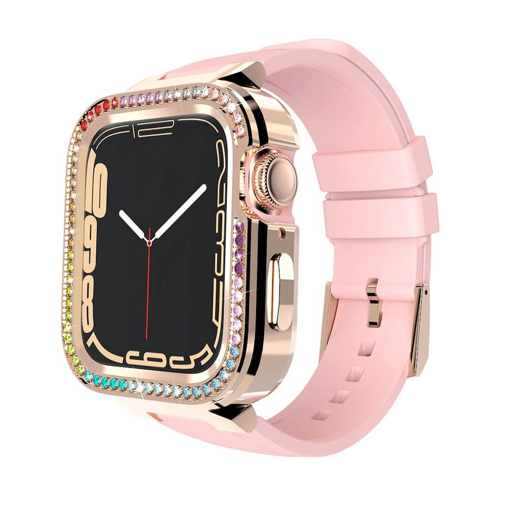 Алуминиев кейс с кристали и вградена силиконова каишка за Apple Watch 40мм, 41мм - Kingxbar Starry Series Strap With Case (златист-розов)