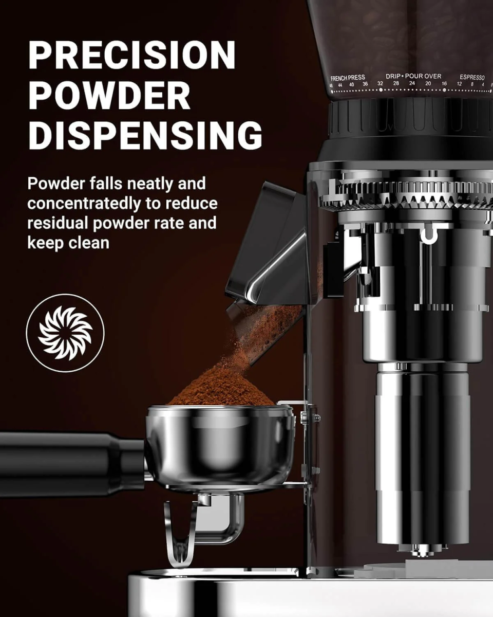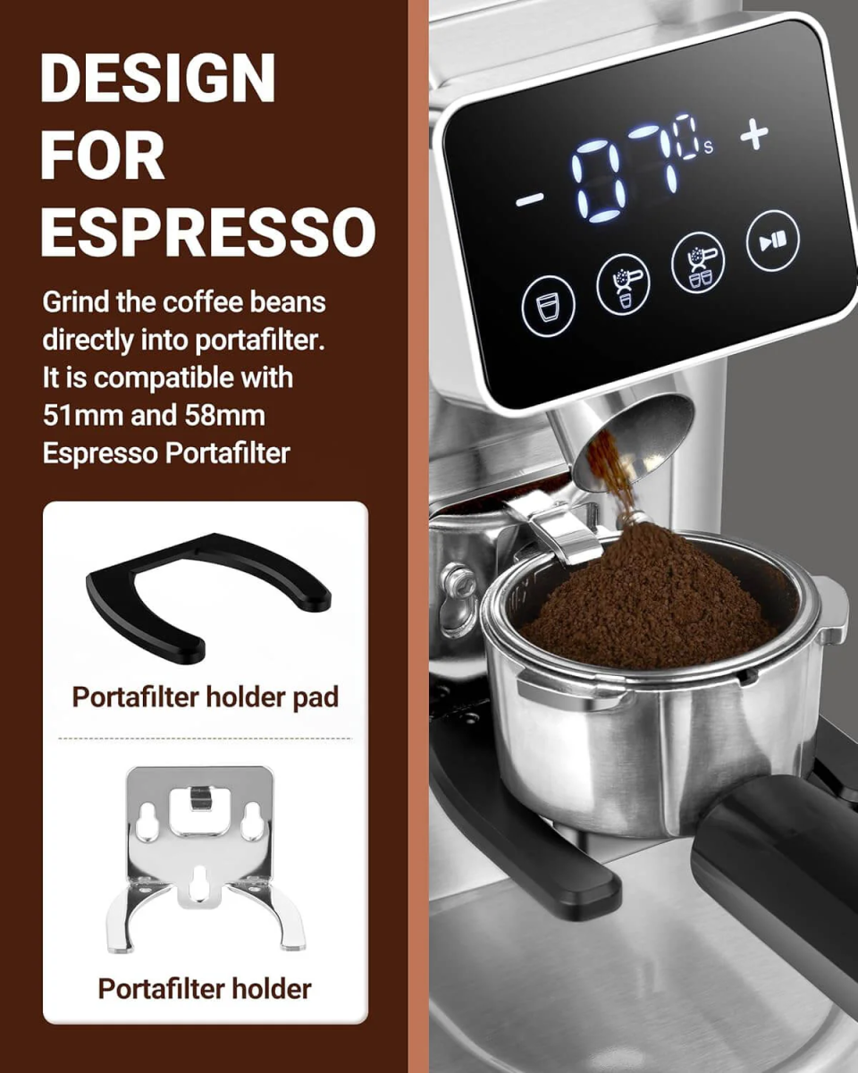 Espresso-Optimized Design: Equipped with a portafilter holder, holder pad, and a 100g stainless steel cup, it’s compatible with 50mm espresso portafilters. This design ensures the ideal coffee quantity for rich, aromatic brews and a premium grinding experience.