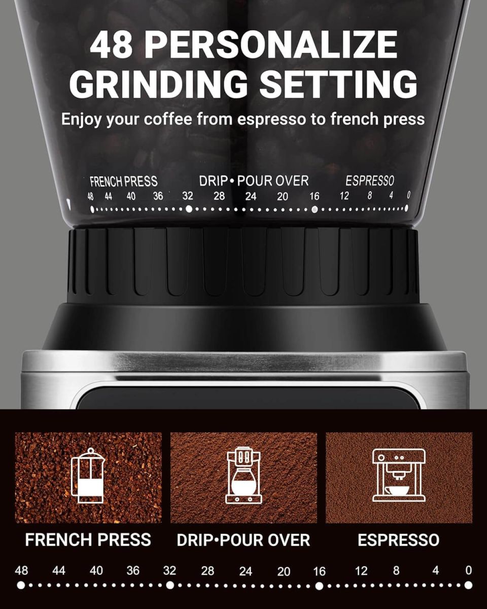 ![]() | Custom Grind for Every Brew Style This coffee grinder features 48 adjustable settings, allowing you to fine-tune the grind size for any brewing method—whether it’s French press, pour-over, drip, or espresso. Enjoy the perfect grind for your favorite coffee style, every time. |