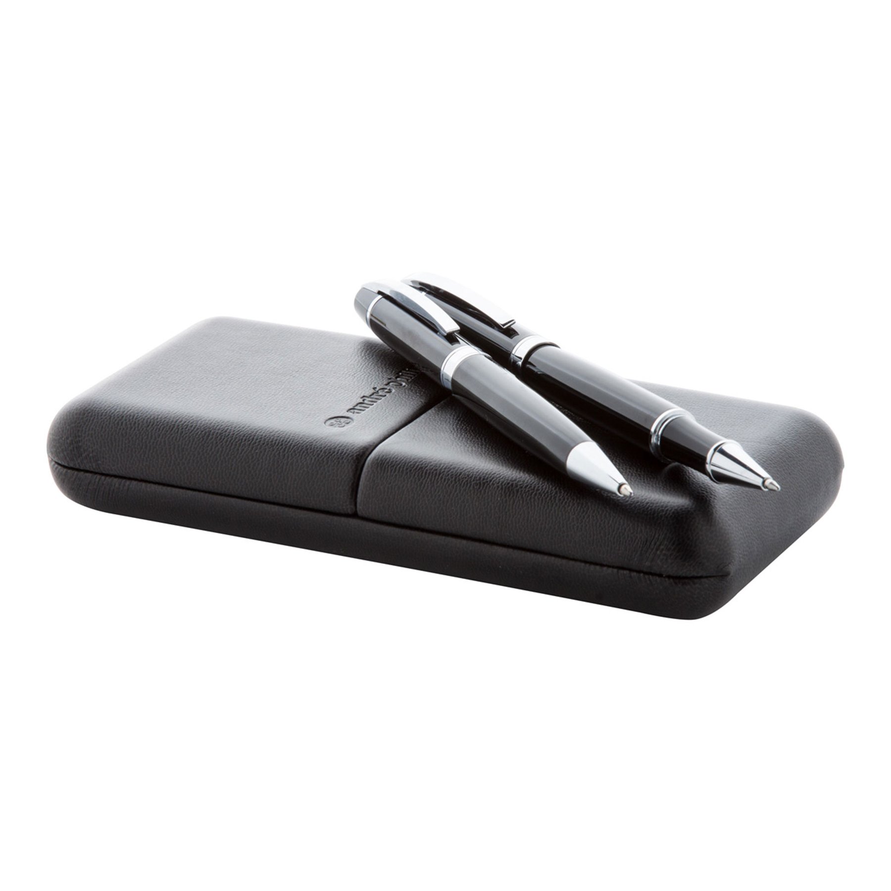 Химикалката и писалката са метални с блестящи детайли и елегантно се допълват с кожената подаръчна кутия.