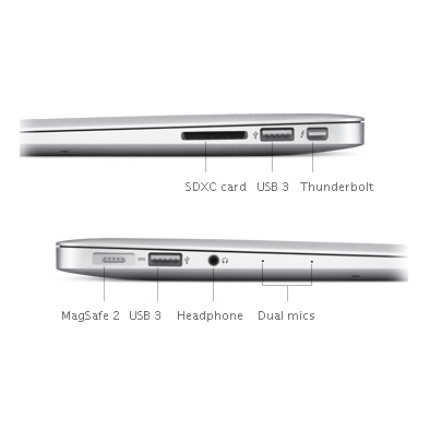 Външни изходи: два USB 3.0 порта (до 5 Gbps), Thunderbolt порт (до 10 Gbps), MagSafe 2, изход за слушалки 3.5 мм., двоен микрофон, SDXC card slot