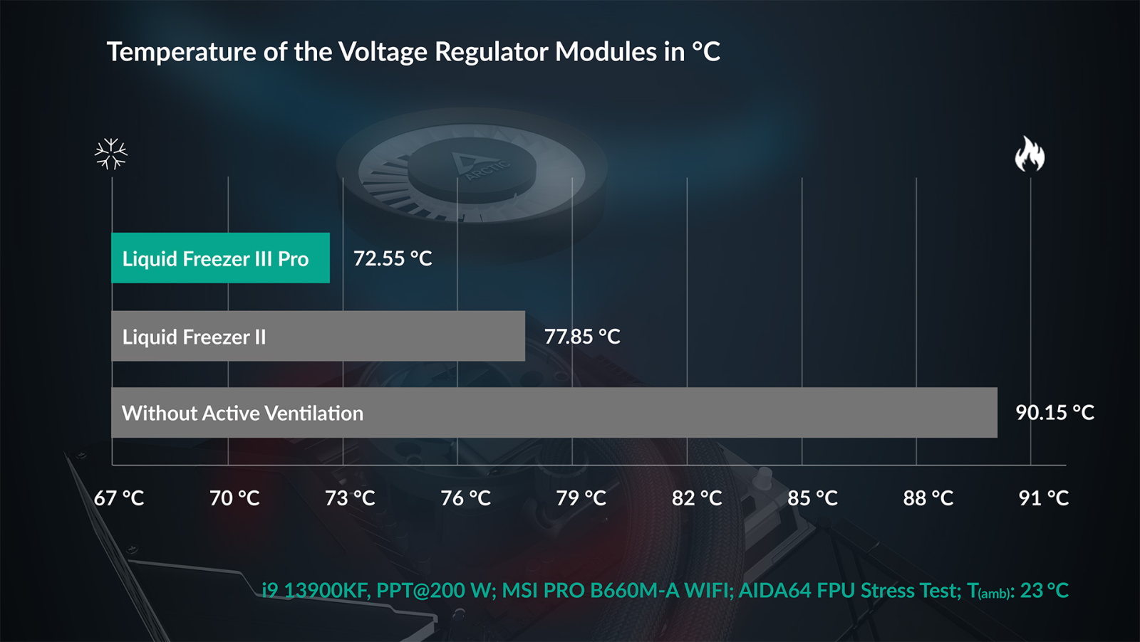 PWM-controlled fan lowers the voltage regulator temperature, ensuring stable performance.