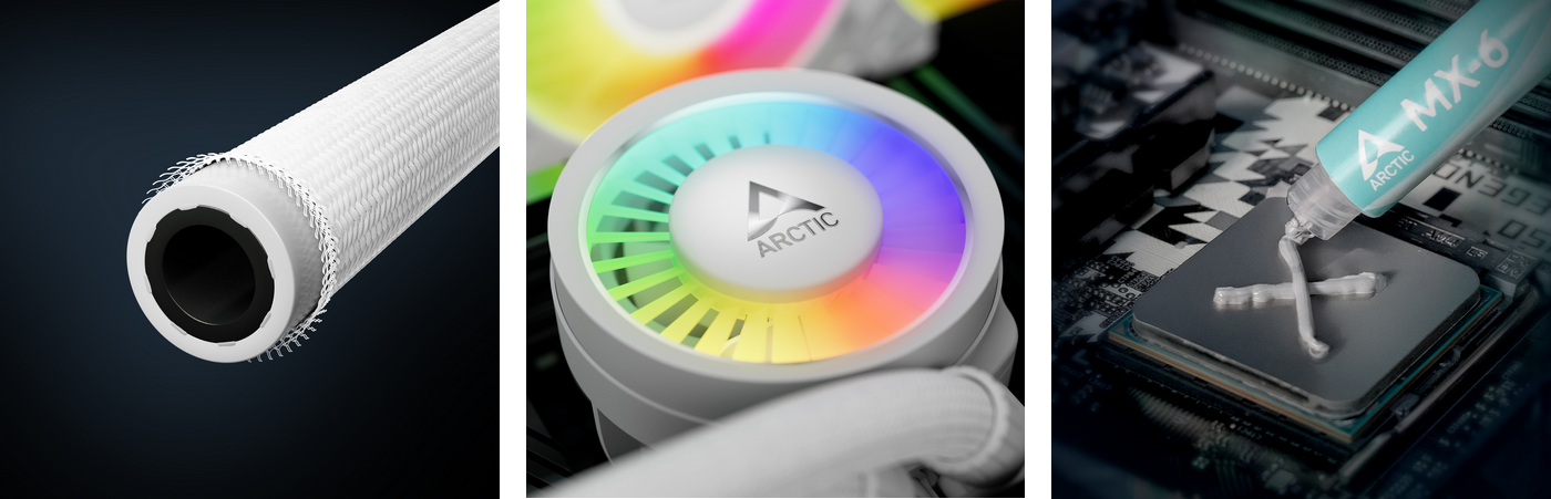 Premium Tubing Reinforced EPDM tubing with braided sheathing for increased durability | Easy Installation Pre-installed, pre-wired fans, straightforward mounting, and an animated online manual. | Includes MX-6 Thermal Paste Simply apply in a cross pattern—the water pump’s cold plate distributes the paste evenly |
