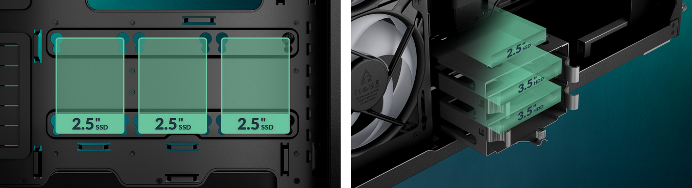 Supports three 2.5" drives behind the motherboard tray. Removable drive cage holds two 3.5"/2.5" and one additional 2.5" drive.