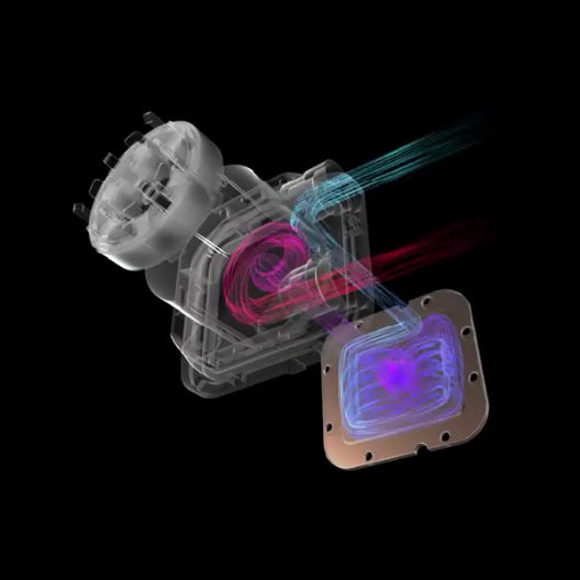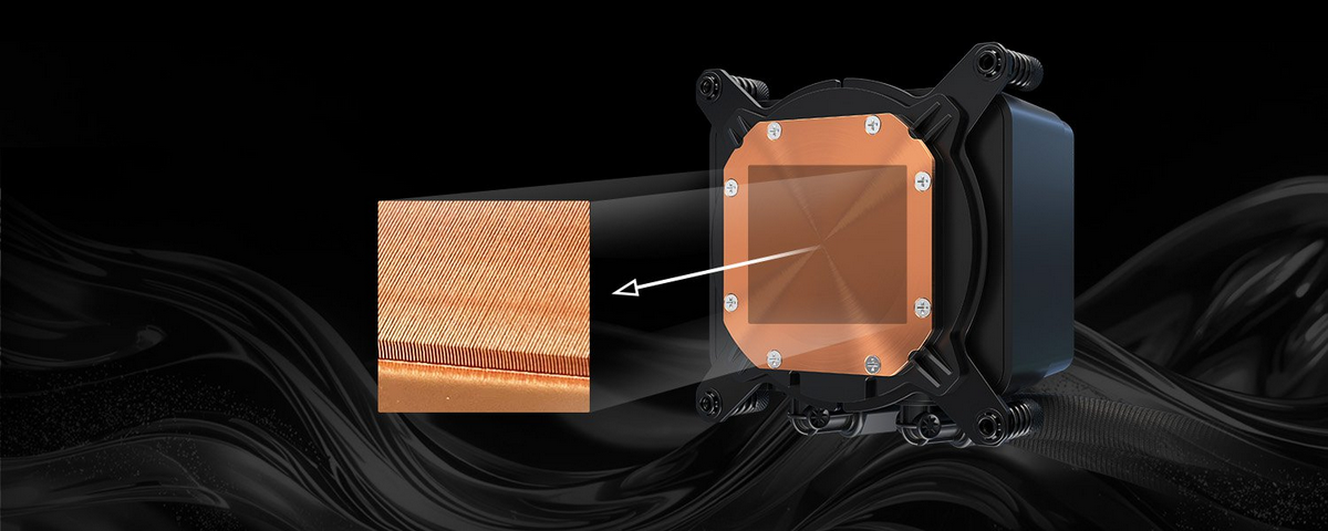 ![]() | Dual-Side Inlet Cooling Path The dual-side inlet cooling path design shortens coolant flow distance while ensuring balanced distribution across the high-density micro-fin array. By delivering coolant directly to the CPU hot spot from multiple directions, the design helps keep temperatures more even and improves overall thermal efficiency. |