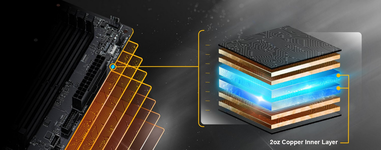 2 ounce copper inner layers that provide stable signal traces and power shapes! Delivering lower temperature and higher energy efficiency for overclocking.