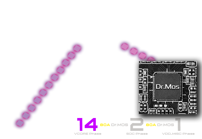 - 14+2+1 Power Phase, 80A Dr.MOS for VCore+SOC with Enlarged Heatsink Armor