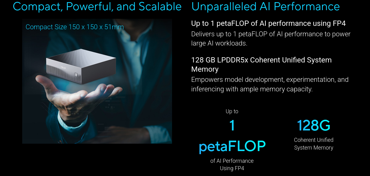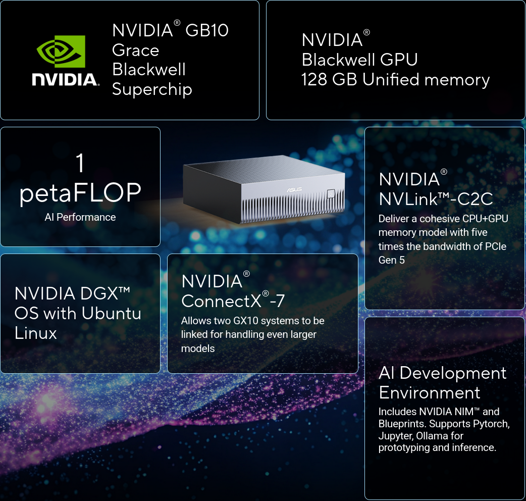 - Extreme AI Performance: Powered by NVIDIA® GB10 Grace Blackwell Superchip delivering 1 petaFLOP of AI performance and 128GB memory for 200B model fine-tuning.