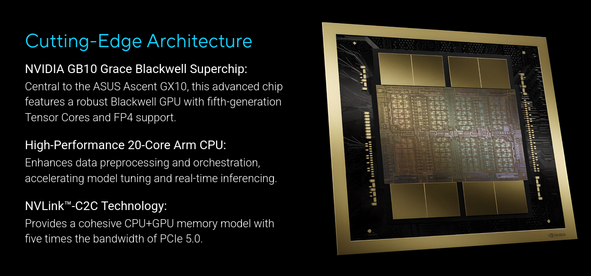 - Scalable Architecture: Featuring NVIDIA® NVLink™-C2C for ultra-fast CPU-GPU memory communication and NVIDIA® ConnectX-7 networking to support dual GX10 system stacking, unlocking superior scalability and performance.