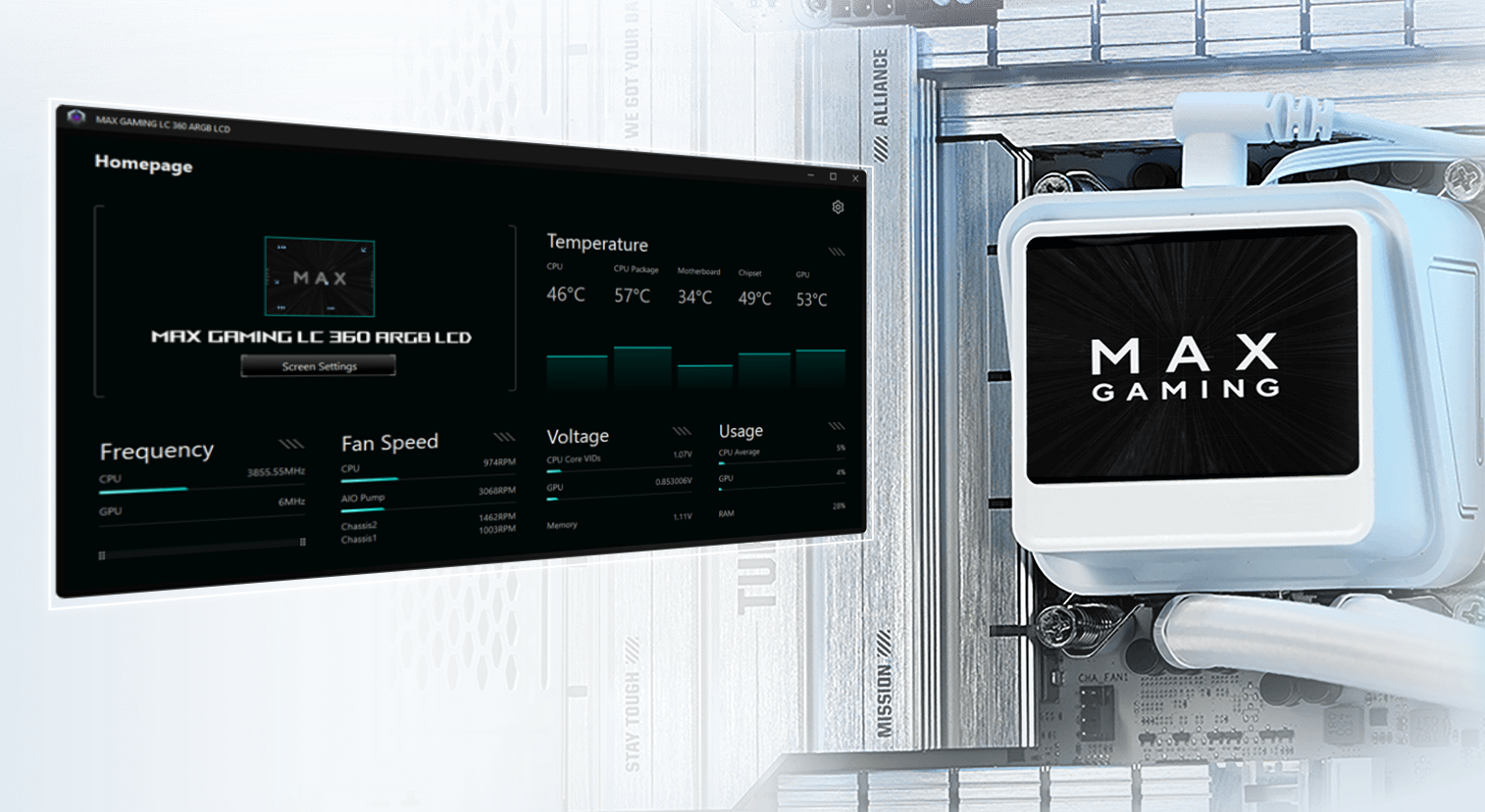 The pre-installed & daisy-chainable ARGB fans on the Max Gaming LC 360 ARGB LCD streamline the installation process. By connecting a cable with two headers, users can link both the ARGB lighting and the fans, simplifying cable management. The fans provide a clean appearance and also deliver strong and stable airflow, further enhancing the cooling capabilities of your system.