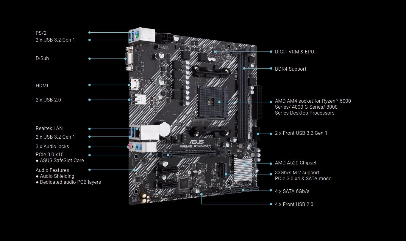Prime ASUS Prime series is expertly engineered to unleash the full potential of 3rd Generation AMD Ryzen platform. Boasting a robust power design, comprehensive cooling solutions and intelligent tuning options, Prime A520 series motherboards provide daily users and DIY PC builders a range of performance tuning options via intuitive software and firmware features. |