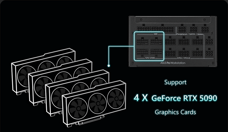 Heavy-Duty Power Designed to reliably deliver the thousands of watts necessary to power up to four NVIDIA GeForce RTX 5090 graphics cards, the ASUS Pro WS 3000W Platinum enables breakthrough performance that meets the needs of demanding AI workloads.