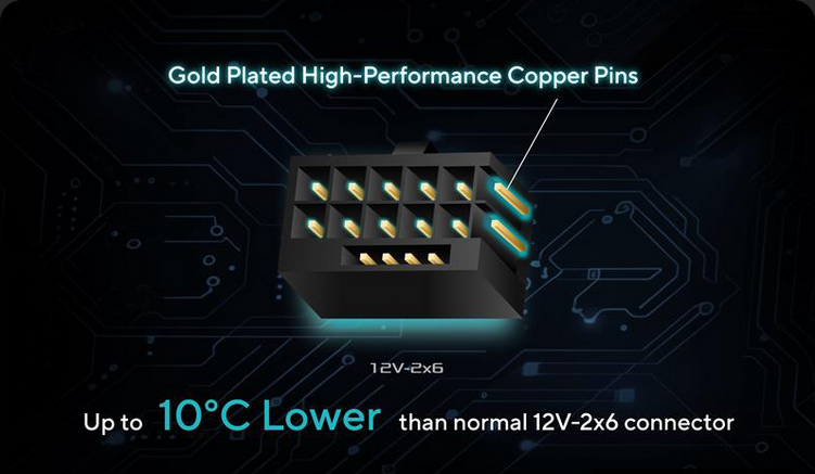 Gold-Plated High-Performance Copper Pins The copper pins of the PCIe connectors in this PSU have been upgraded with gold plating to help ensure cooler operation and improved power delivery efficiency. This plating translates to a significant reduction in normal 12V-2x6 connector temperatures (up to 10°C), promoting optimal performance and stability for even the most demanding graphics cards. Furthermore, the improved contact between socket pins and connectors reduces resistance and improves durability for connector insertion and removal, ensuring reliable cooling performance. | ![]() |