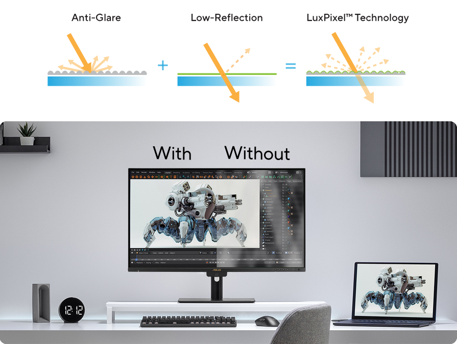 LuxPixel™ technology is an anti-glare, low-reflection (AGLR) coating that provides a paper-like screen effect. Unlike traditional matte panels which often soften imagery, LuxPixel™ technology minimizes reflections to ensure the user sees accurate colors and sharp details.