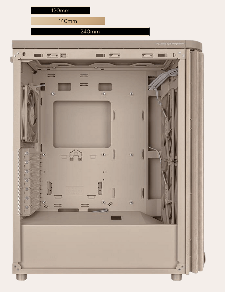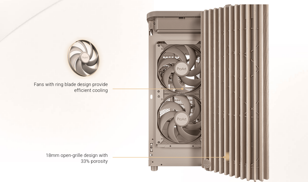 The ProArt PA401 Wood Edition Beige features two pre-installed 160mm front fans and accommodates both horizontal and vertical graphics card mounting.