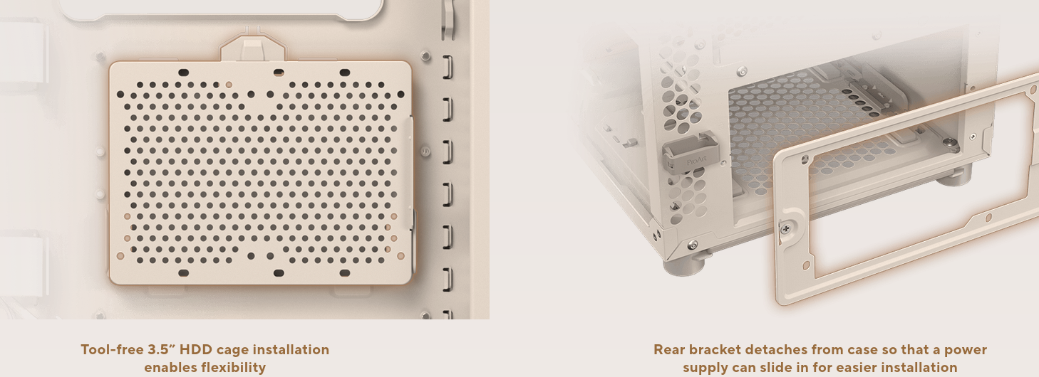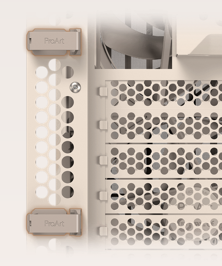 Further refining the signature ash wood front panel on ProArt PA401, a new beige finish brings a modern aesthetic to the premium wood material. Plus, an updated white cable set ensures cohesive visual flow throughout the build.