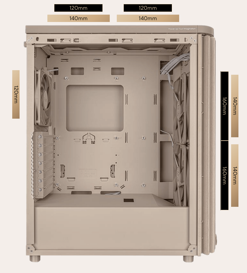 The PA401 Wood Edition features a front grille with 33% porosity to maximize airflow and ventilation. Meanwhile, built-in dual 160mm front fans efficiently deliver up to 138cfm of airflow to graphics cards and CPU coolers, and the outer ring connecting these fan blades helps reduce initial vibration. The front fans and the 120mm rear fan with PWM control yield optimal airflow, low noise, low vibration and high reliability.