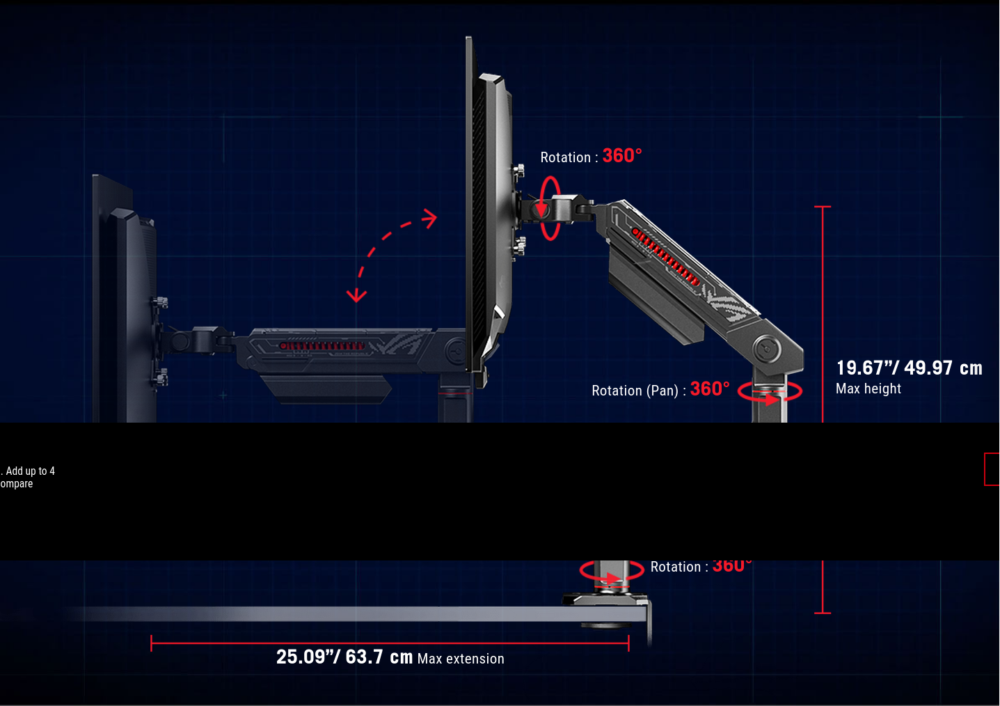 The mechanical spring system of the ROG Ergo Monitor Arm allows for smooth, effortless adjustments through a wide range of movements. Tilt, swivel, or pivot the monitor to the desired position.