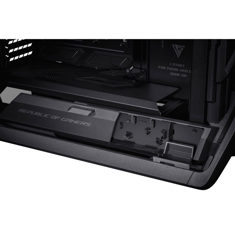 Structure and Style A front side air intake can provide ample ventilation to get just the right balance of temperatures for your system and graphics cards. This integrates tightly into a bold new look with features like the distinctive diamond-shaped badge on the front, stamped with the famous ROG logo and surrounded by diagonal slashes. | ![]() |