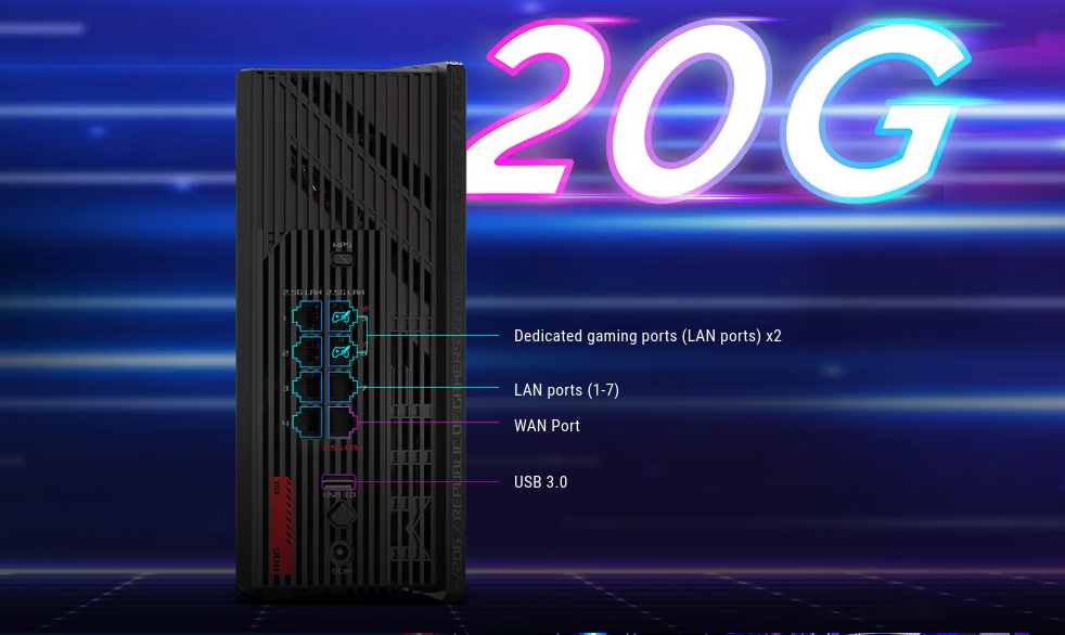 With one 2.5G WAN port and seven 2.5G LAN ports, the ROG Strix GS-BE18000 delivers up to 20G of lightning-fast wired speed, ensuring peak performance for multiplayer and other demanding tasks. Additionally, the robust network design offers stable, optimal connectivity even under heavy load.