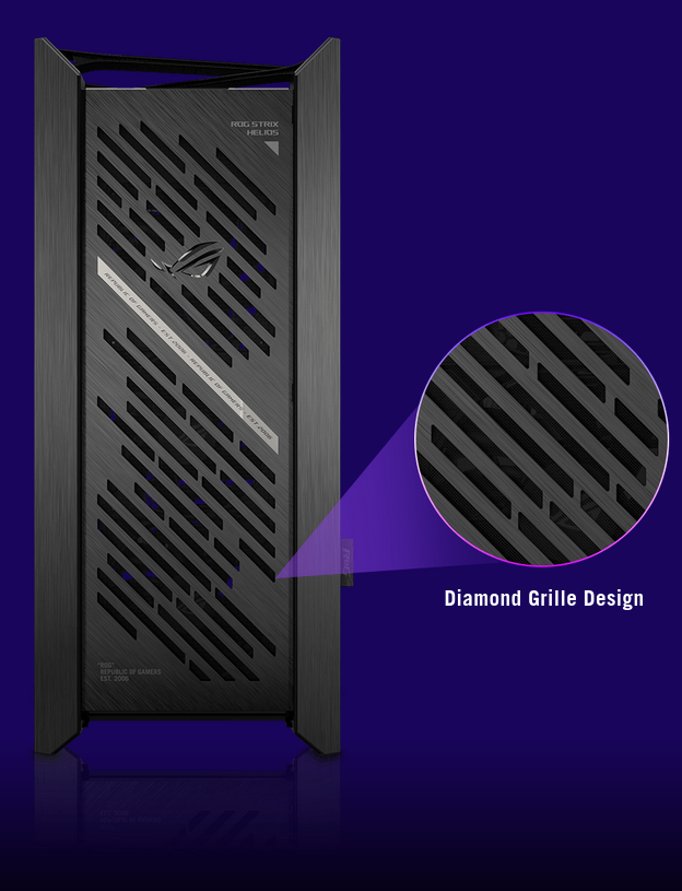 ![]() | Premium Design & Aesthetics ROG Strix Helios II is made for showcase builds with dual 4mm-thick tempered glass side panels fitted in a refined brushed-aluminum frame. The aluminum front panel, featuring a diamond grille design, is manufactured using high-precision CNC milling technology and an anodizing process. The diagonal slashes on the front are inspired by race car elegance and individuality to make the Helios II unique. With rounded edges, a streamlined shape and hidden seams, this chassis is sleeker than ever. | |||