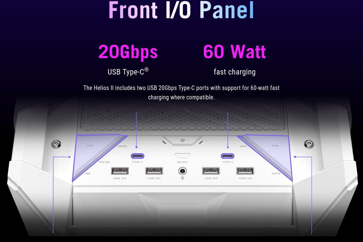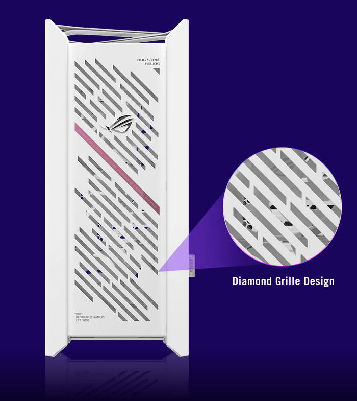 ROG Strix Helios II White Edition is made for showcase builds with dual 4mm-thick tempered glass side panels fitted in a refined brushed-aluminum frame. The aluminum front panel, featuring a diamond grille design, is manufactured using high-precision CNC milling technology and an anodizing process. The diagonal slashes on the front are inspired by race car elegance and individuality to make the Helios II unique. With rounded edges, a streamlined shape and hidden seams, this chassis is sleeker than ever.
