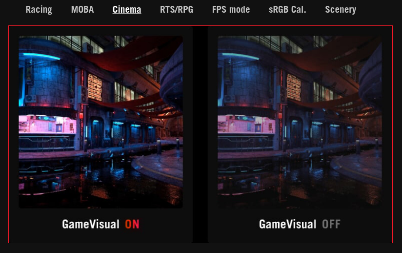 Asus GameVisual technology offers seven pre-set display modes to optimize visuals for different types of content. This unique feature can be easily accessed using a hotkey or via the OSD settings menu.