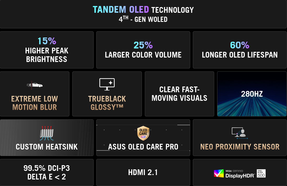 - ASUS OLED Care Pro with Neo Proximity Sensor precisely detects when the user is away and switches to a black screen to reduce the risk of burn-in