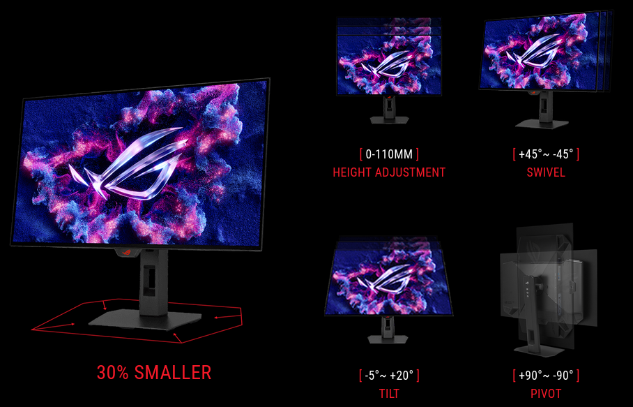 The new ROG Strix OLED series monitors feature a new compact stand that’s 30% smaller than those found on previous-generation XG monitors, freeing up valuable desk space for a keyboard and mouse. The stand offers tilt, swivel, and height adjustments for the ideal viewing position. The display is also VESA wall-mount-compatible.
