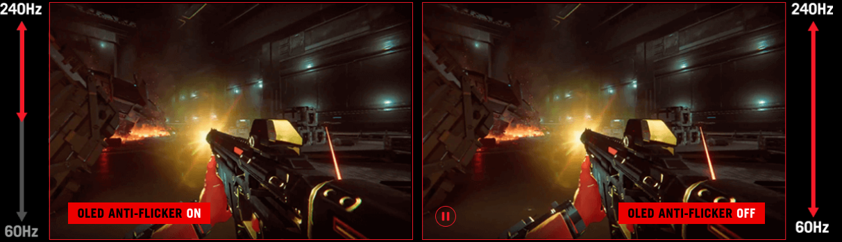 ROG-exclusive OLED Anti-Flicker technology offers three refresh rate ranges (High / Mid / Off) to reduce flicker during refresh rate fluctuations to maintain immersive gaming experiences.