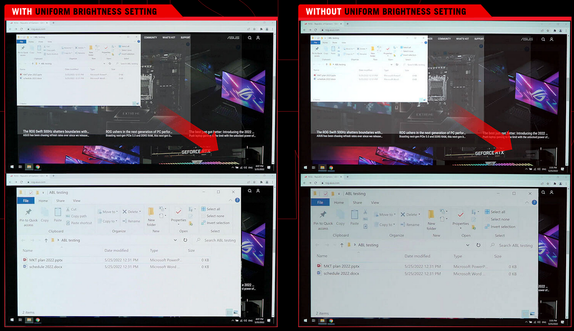 When activated, the ROG-exclusive Uniform Brightness setting within the OSD menu decreases peak brightness to keep levels consistent for better viewing—even when changing the size of bright white windows. It also makes marathon gaming sessions much more comfortable on the eyes.