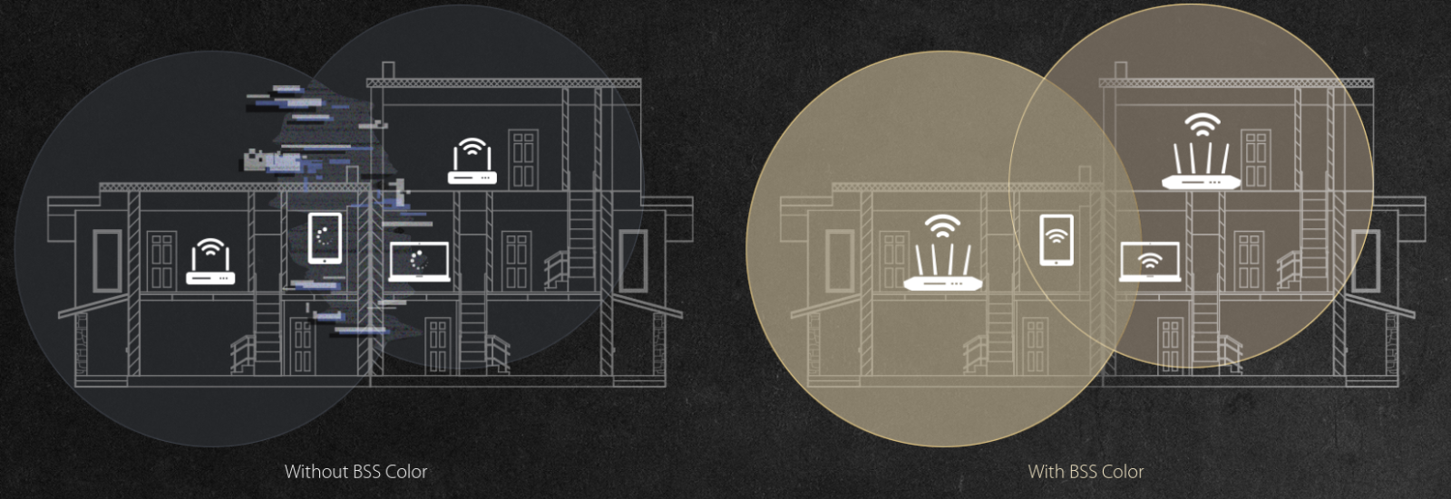 WiFi 6 includes a new feature called BSS Coloring that improves WiFi connection efficiency even in crowded environments. When two neighboring routers send traffic on the same channel, your router has to wait until the channel is free. With BSS Coloring, your WiFi 6 router identifies its data with a unique channel tag ('color') that's different from neighboring networks. Your WiFi 6 router can then ignore other-colored signals on the channel and send data immediately.* This greatly reduces router waiting times and boosts network efficiency.