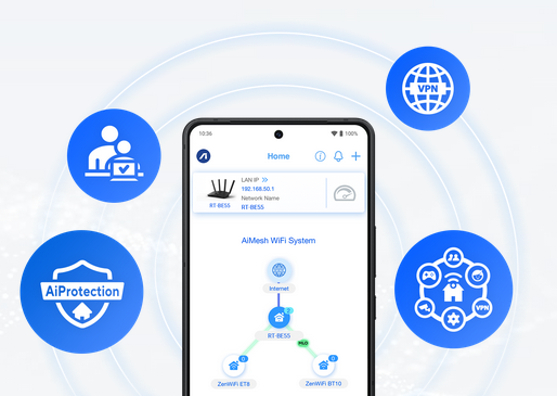 RT-BE55 utilizes the power of WiFi 7 MLO into next-gen AiMesh technology, delivering wider coverage, a more stable and secure network and a feature-rich network experience – all under one network name for your entire smart home.