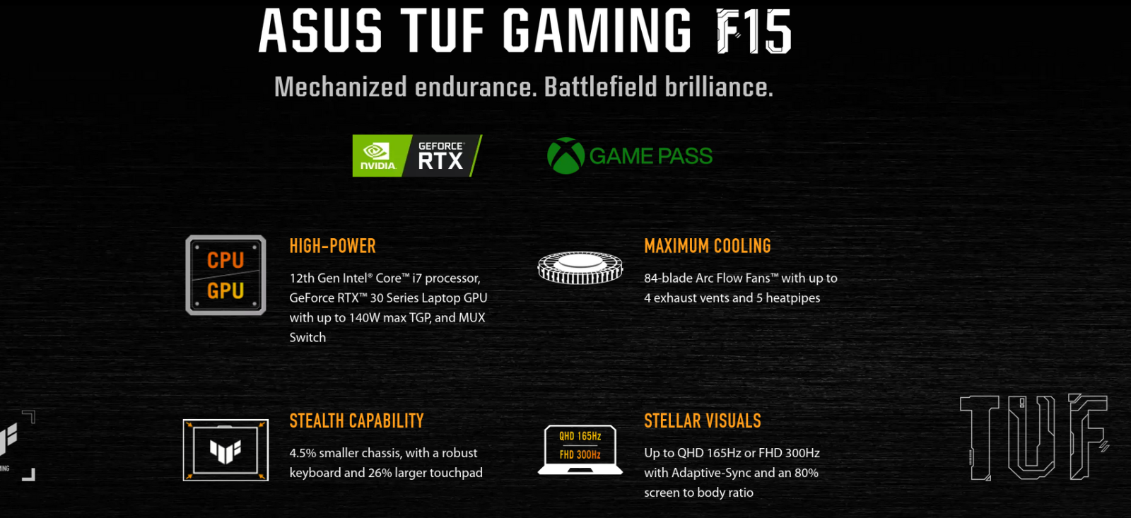 The TUF Gaming chassis has been redesigned for 2022, and is 4.5% smaller than last year’s models. The TUF logo has been reimagined as well, with both embossed and laser-sculpted versions. Despite this size reduction, the brand new 2022 TUF Gaming F15 still houses a large touchpad with anime-inspired accents and four-way indicators.