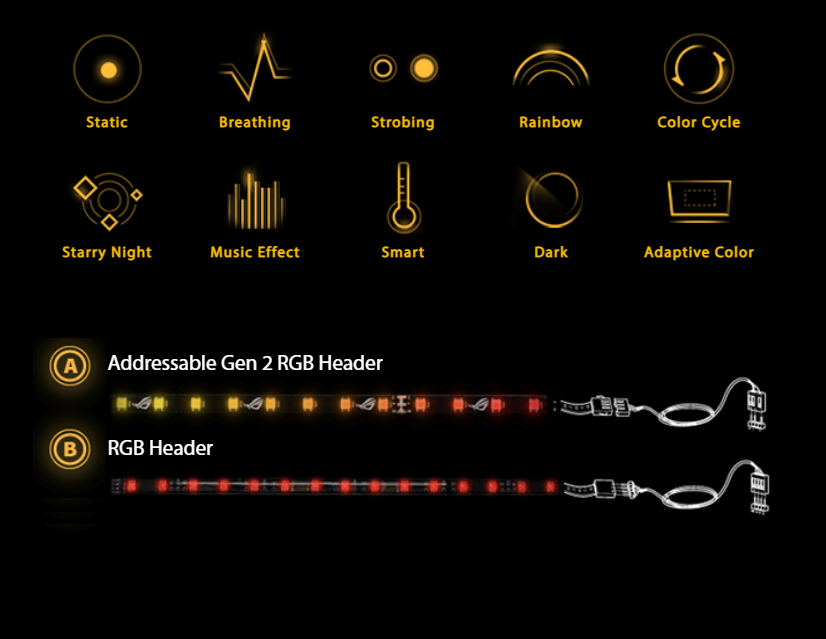 Addressable Gen 2 RGB Header The addressable Gen 2 RGB header is now capable of detecting the number of LEDs on second-gen addressable RGB devices, allowing the software to automatically tailor lighting effects to specific devices. The new header also offers backward-compatibility with existing addressable RGB gear. |