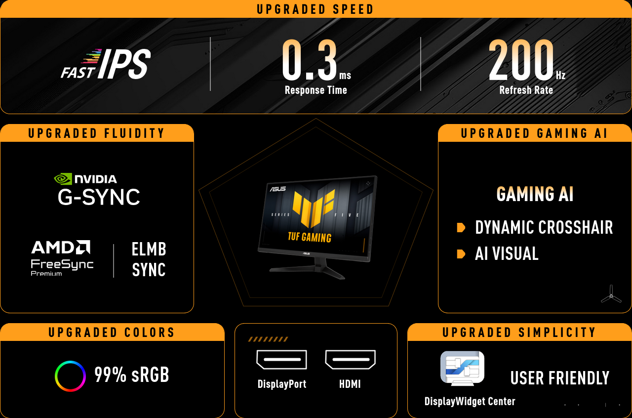 TUF Gaming Series 5 - VG249Q5A Gaming Monitor – 23.8-inch Full HD Fast-IPS panel, 200Hz, 0.3ms , G-SYNC® compatible, AMD FreeSync™ Premium, ELMB SYNC, 99% sRGB, DisplayWidget Center, Gaming AI