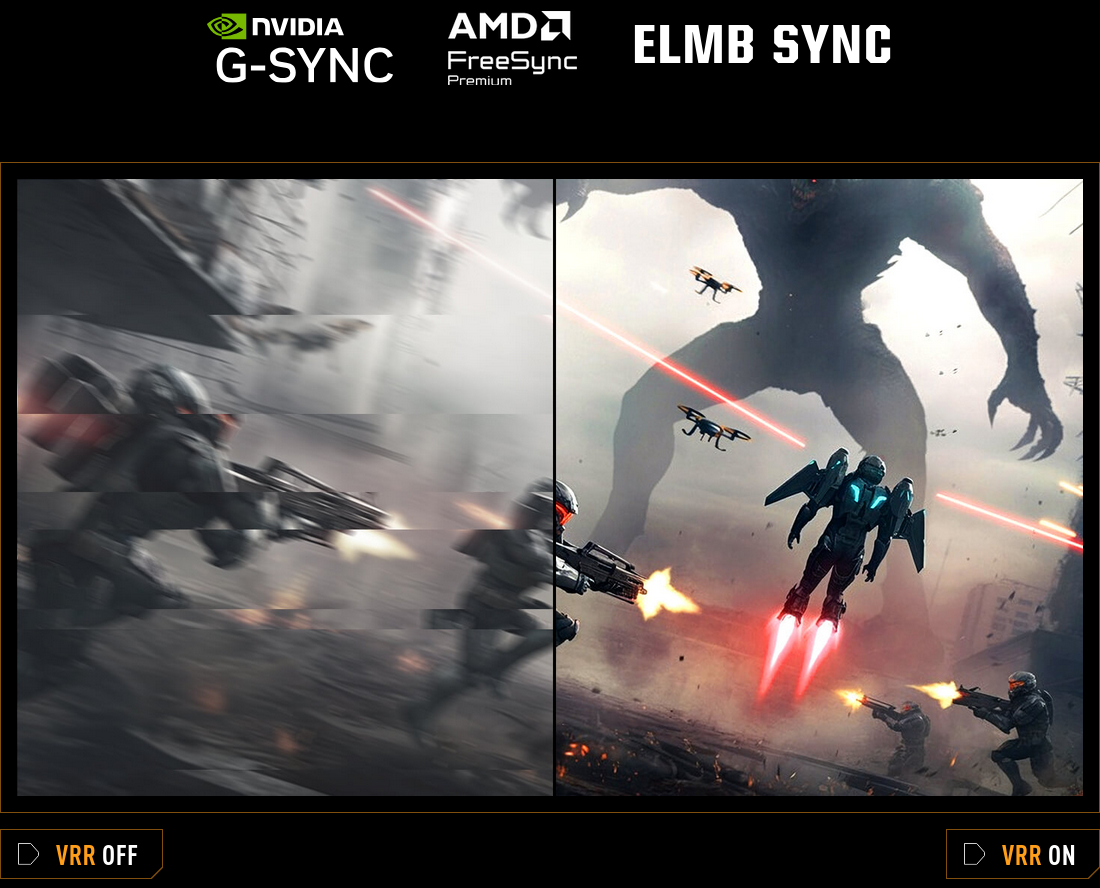 - ASUS Extreme Low Motion Blur Sync (ELMB SYNC) technology enables ELMB together with variable refresh rate, eliminating ghosting and tearing for sharp gaming visuals with high frame rates