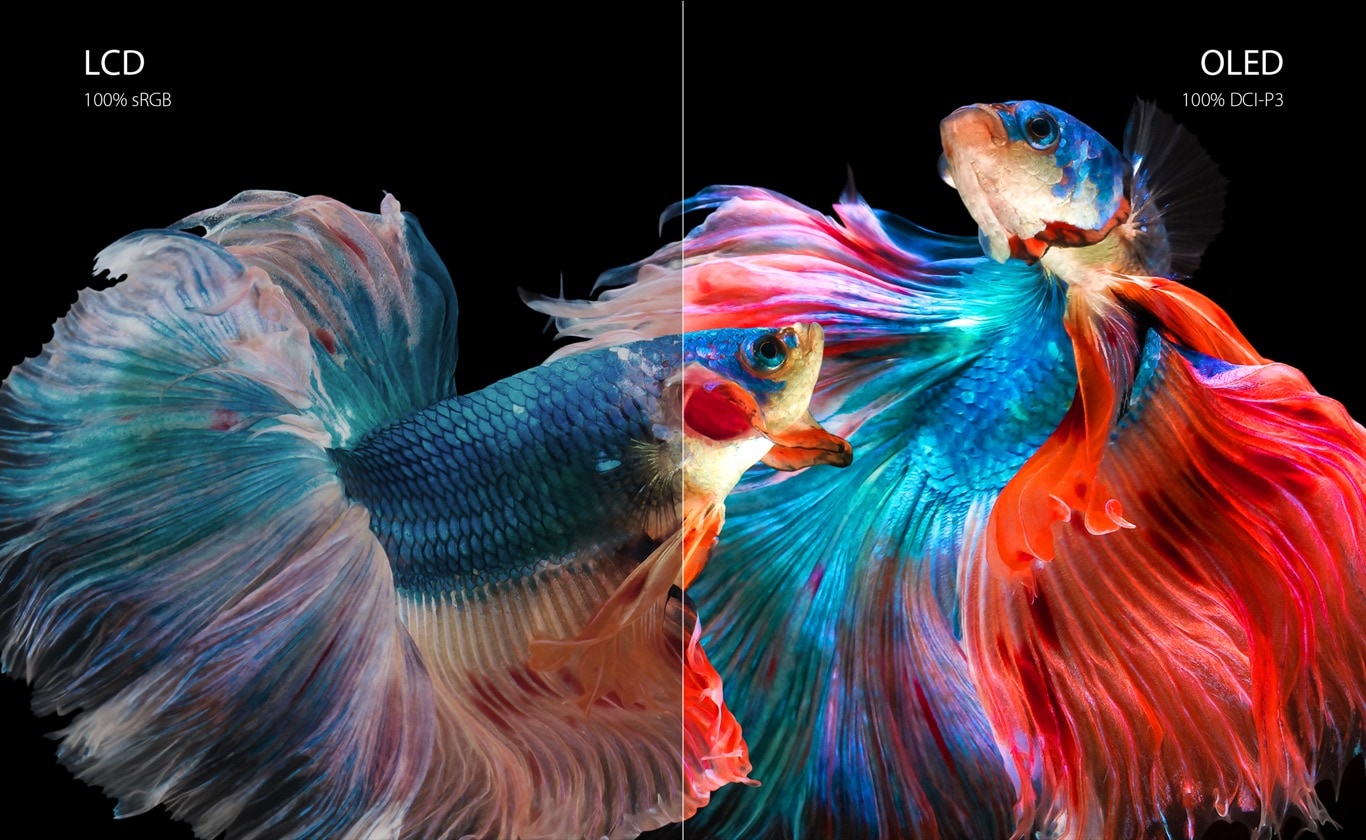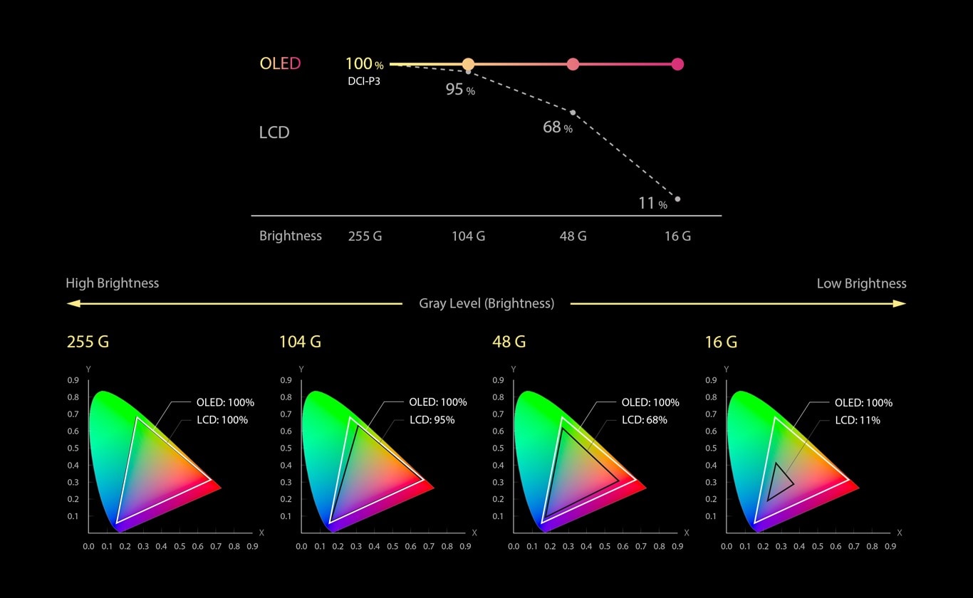 Лаптопите ASUS OLED поддържат 100% от DCI-P3 цветовата гама както при високи, така и при ниски нива на яркост, докато при LCD лаптопите цветовата гама драстично се редуцира при ниските нива на яркост. При яркост с ниво на сивото 16 G LCD лаптопите възпроизвеждат едва 11% от DCI-P3 цветовата гама, а лаптопите ASUS OLED поддържат 100% от DCI-P3 цветовата гама.