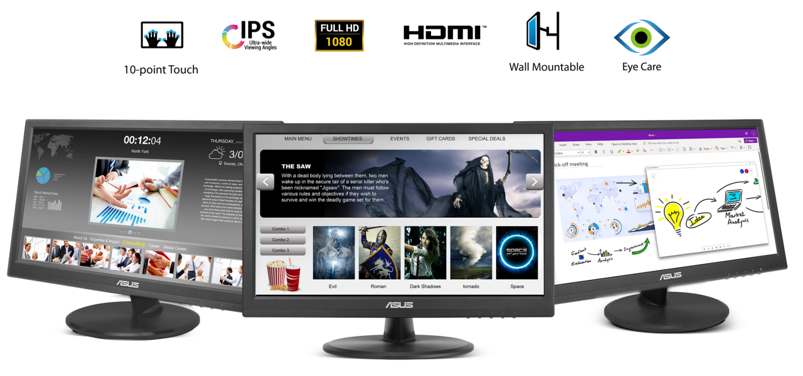 ASUS VT169HE is a 15.6-inch Full HD(1920x1080) IPS monitor which combines 10-point multi-touch capability with superb image quality, flexible connectivity, durability and sustainability.